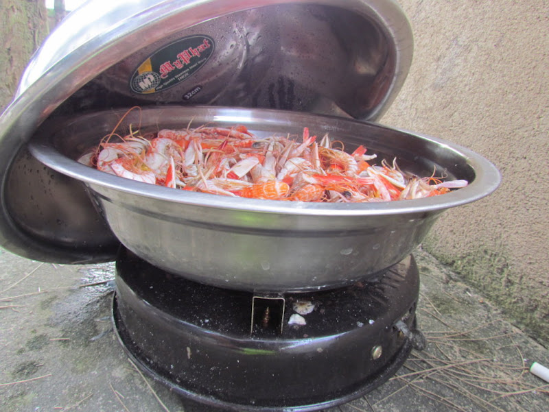 Mua 1 mớ bề bề, tôm biển của bà con, rửa ngay dưới biển và mang về hấp bằng bếp cồn |